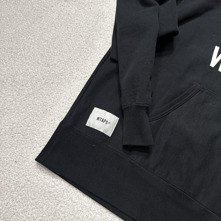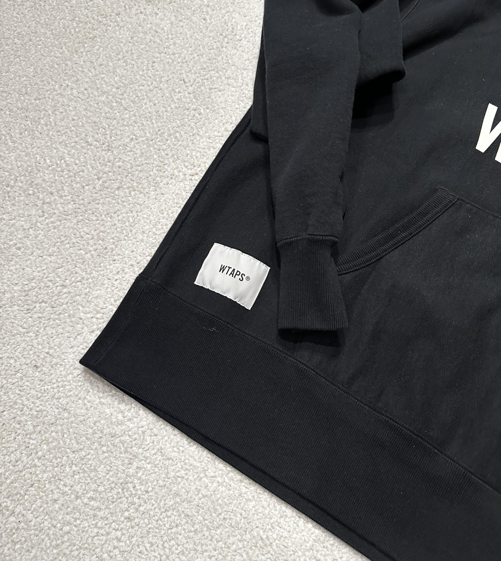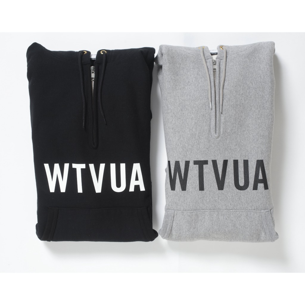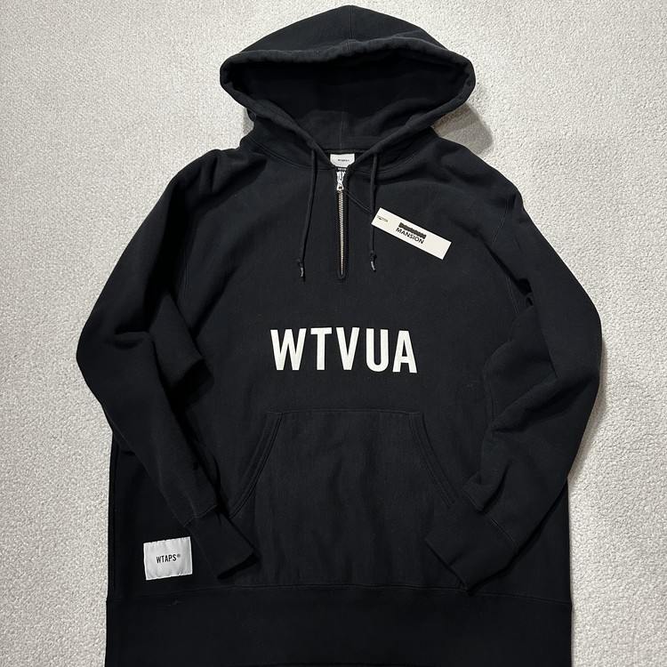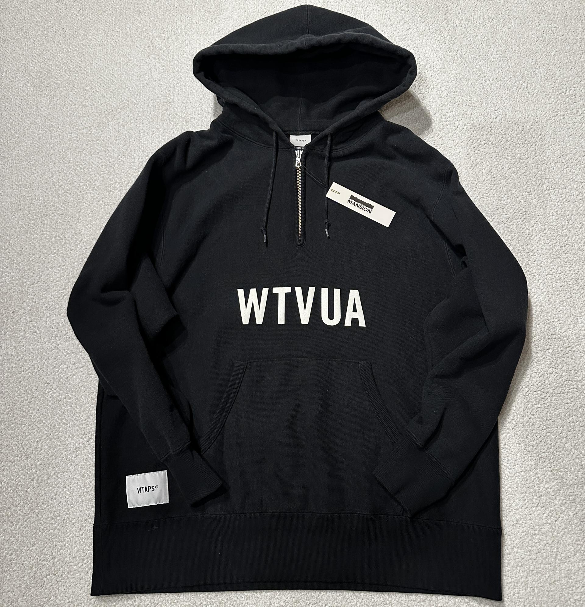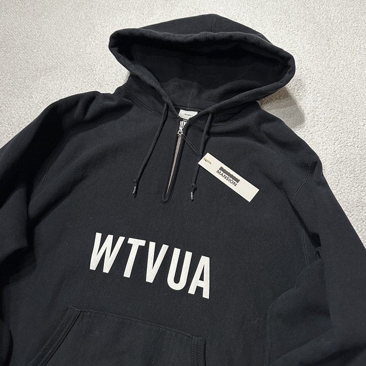 18SS에 발매한 아웃트리거 후드 제품으로 탄탄한 스웻 재질에 하프집업을 차용한 디테일이 그 특징입니다. 가슴 하단부에는 더블탭스를 상징하는 WTVUA 마킹이 전사처리 되어 있으며 프린팅에 데미지 및 오염 등은 전혀 없는 최상급 상태입니다.