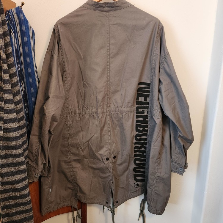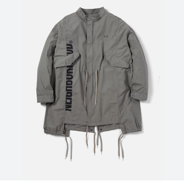 해당 제품은 네이버후드에서 22SS에 발매된 피쉬테일 코트입니다. SS 시즌 발매제품답게 피쉬테일의 모습을 그대로재현하면서 탄탄한 외겹의 원단으로 제작되었습니다. 특히 다수의 원단을 엮어 만든것 같은 패턴 그리고 앞 뒤로 다른 포인트의 로고플레이가 특징입니다. 다양한 스트링 디테일을 통해 화려함을 더했지만 단품으로 구성되어 과해보이지 않습니다.