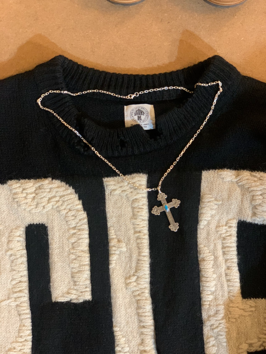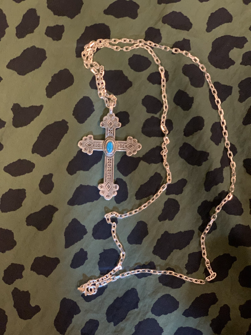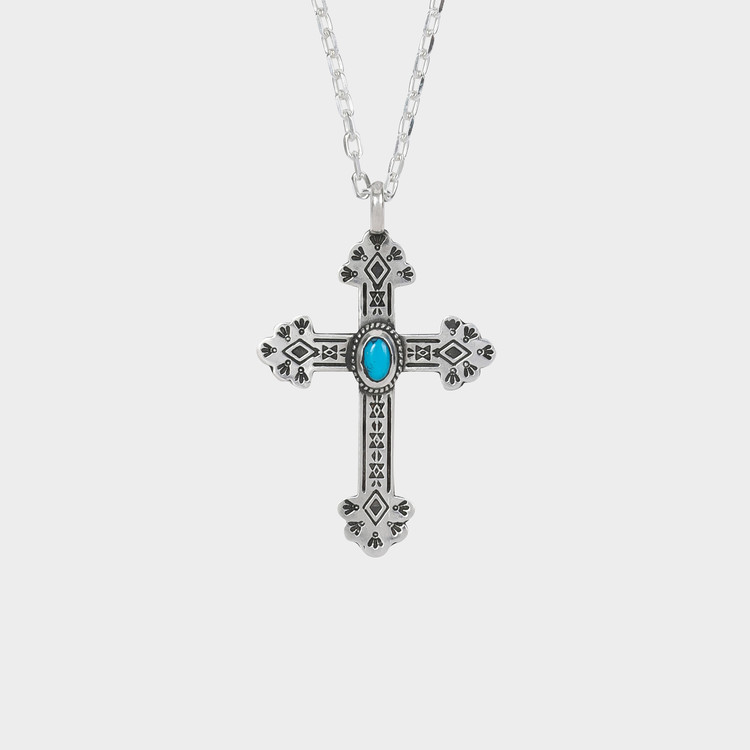 십자가 모양에 네이티브 패턴과 터키큐빅을 세팅함으로써 네이티브 아메리칸 주얼리적인 요소를 담아내었습니다.