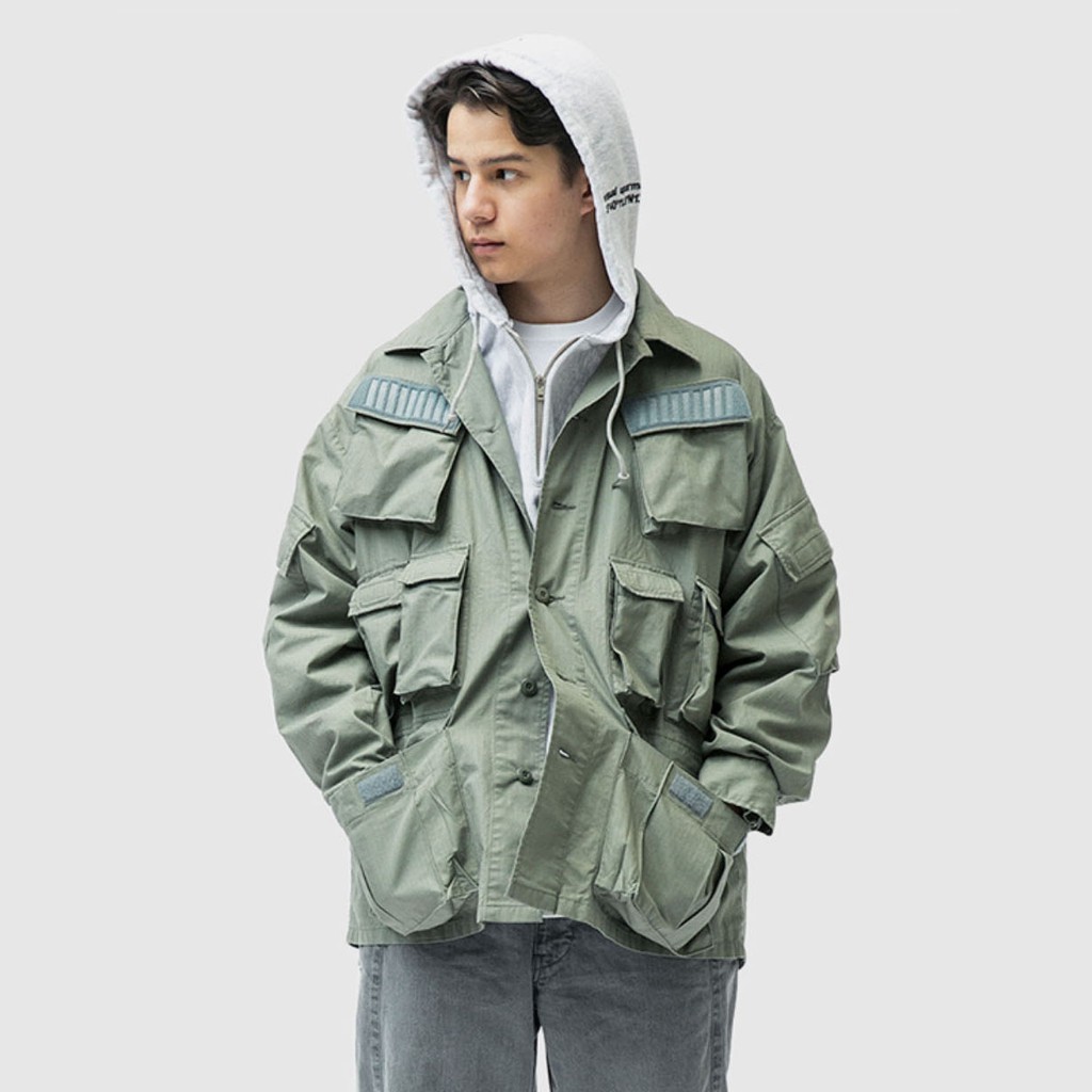 밀리터리 무드로 일관된 더블탭스의 19AW 제품중 모듈라 자켓과 더불어 더블탭스 매니아들의 센세이션을 자극했던19AW 모듈라 셔츠입니다. 양쪽 가슴에 탄창 모양을 형상화하여 벨크로 부착을 하였고, 자켓과 마찬가지로 여러 활용의포켓을 설치하여 즐거움을 더했습니다.